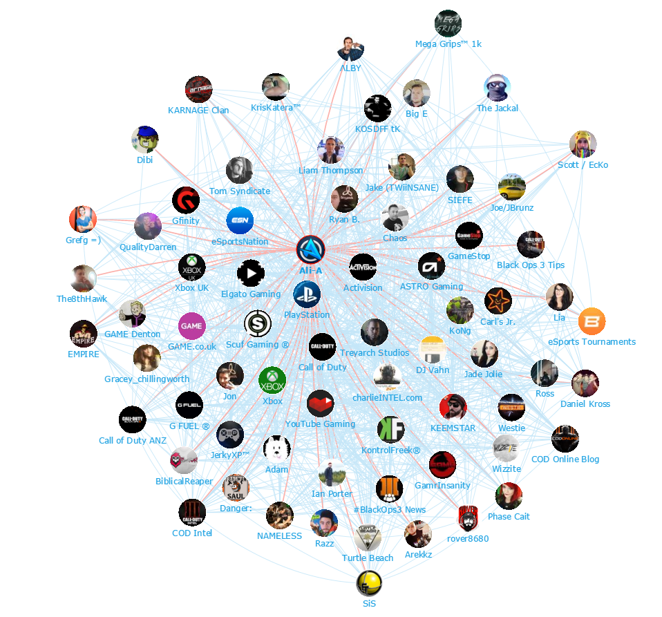 We were very interested to see which influencers and brands drove the most conversation on Twitter, so we analysed over 729K tweets from 4th – 9th November on the following query (#callofdutyblackops3 OR #cod3 OR #nu3town OR #BlackOps3 OR #BlackOpsIII OR #BackInBlack OR #BO3) and identified the top 100 most influential brands and individuals leading the discussion on Twitter. We discovered a very engaged community of gamers, YouTubers, tech enthusiasts, celebrities and brands all chatting about the game. Below you can see a network map of the online conversation created with our Influencer Relationship Management software IRM. This map shows Call of Duty’s official Twitter Handle at the centre, and the conversations to and from the influencers in its field.