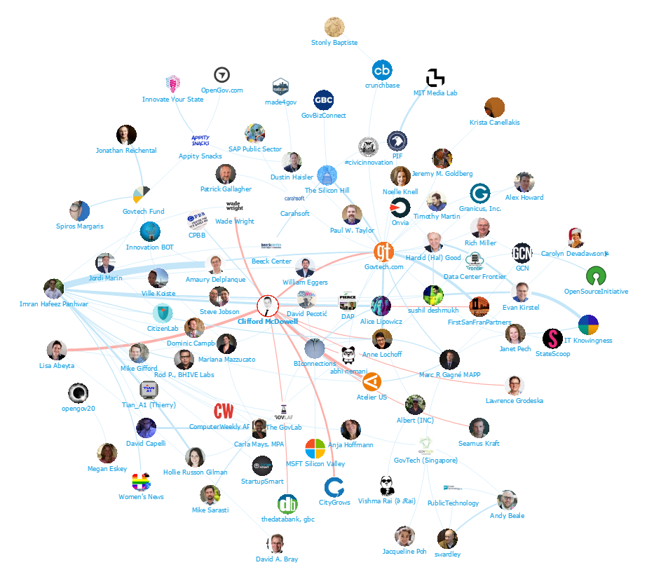 We were very interested in seeing which brand and individuals were leading the discussion around GovTech, so we analysed over 390K tweets mentioning the key words: govtech OR “gov.tech” OR “gov tech” OR ((“public services” OR public services OR “transport service” OR transportservice OR “transport services” OR transportservices OR “health service” OR healthservice OR “public sector” OR publicsector OR government) AND (“new tech” OR newtech OR “new technology” OR newtechnology OR “emerging tech” OR emergingtech OR “emerging technology” OR emergingtechnology OR efficiency OR innovation OR “tech firms” OR techfirms OR “technology firms” OR technologyfirms OR “tech companies” OR techcompanies OR “technology companies” OR technologycompanies)) from 7th October – 29th October 2016. We then identified the top 100 most influential brands and individuals leading the discussion on Twitter. What we discovered was a very engaged community, with much discussion between individuals and brands. Below you can see a network map of the online GovTech conversation with the Top 20 influencer Clifford McDowell at the centre. This map was created with our Influencer Relationship Management software (IRM). Be sure to click on the map to enjoy the full size network diagram in greater detail.